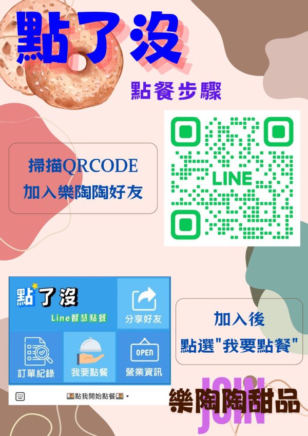 🥯關於樂陶陶🥯 在桃園龍潭的某個角落,有一個小小的甜品店-『樂陶陶甜品』。這裡沒有華麗的裝潢,卻有著最真誠的笑容和最美味的甜品,堅持質樸的風格,從食材的選擇到烹飪的技藝,力求將最真實的味道呈現給每一位品嚐的人。這裡不追求繁複,而是用心雕琢每一道甜品,讓您在每一口都感受到滿滿的幸福和滿足。來到『樂陶陶甜品』,不僅是一場美味的旅程,更是一次與家人朋友共享甜蜜時光的體驗。 加入LINE好友 訂餐請參考點了沒點餐操作